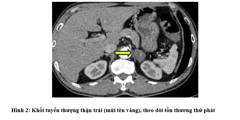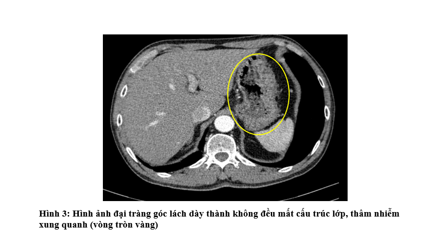 - Chụp Cắt lớp vi tính ổ bụng: Hình ảnh khối tuyến thượng thận trái 21x32mm - theo dõi tổn thương thứ phát. Đại tràng góc lách dày thành không đều quanh chu vi 15mm trên đoạn dài 61mm mất cấu trúc lớp, thâm nhiễm xung quanh kèm nhiều hạch lân cận lớn nhất kích thước 9x5mm