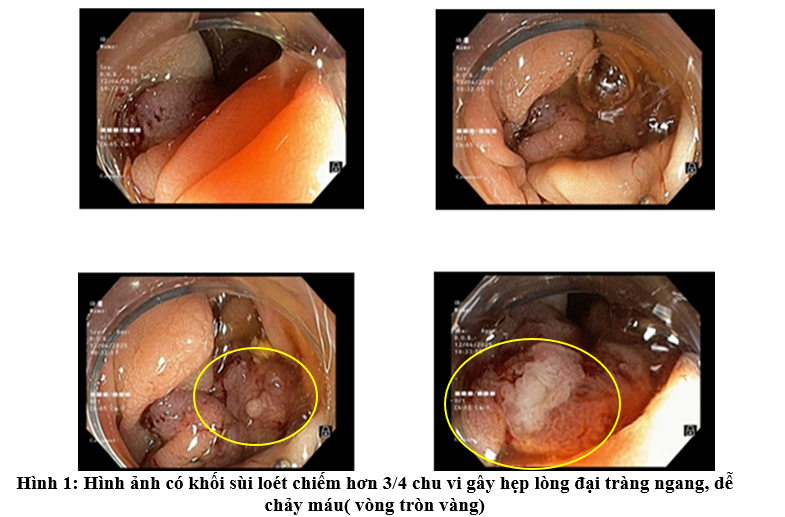 - Nội soi đại trực tràng: Đại tràng ngang có khối sùi loét chiếm hơn 3/4 chu vi gây hẹp lòng đại tràng, dễ chảy máu