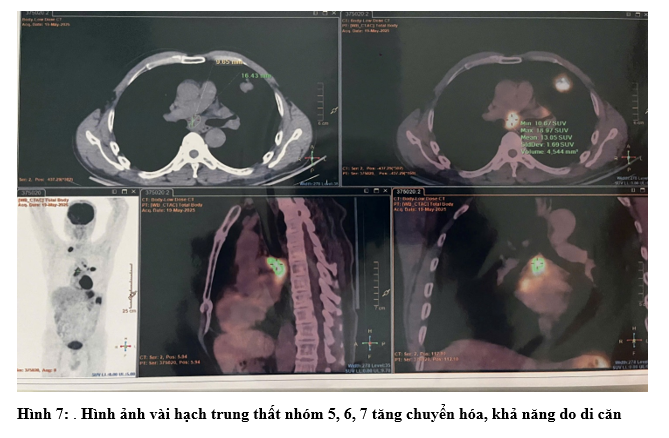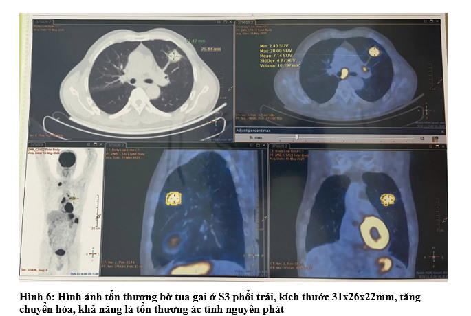 - Chụp PET/CT: Hình ảnh dày thành đại tràng góc lách, dày nhất 18mm, trên đoạn 41mm, tăng chuyển hóa, thâm nhiễm mỡ xung quanh. Vài hạch ở cạnh tổn thương đại tràng, cạnh động mạch chủ bụng và cạnh thân tụy tăng chuyển hóa, khả năng do di căn. Hình ảnh tổn thương bờ tua gai ở S3 phổi trái, kích thước 31x26x22mm, tăng chuyển hóa, khả năng là tổn thương ác tính nguyên phát. Hình ảnh vài hạch trung thất nhóm 5, 6, 7, hạch thượng đòn Phải tăng chuyển hóa, khả năng do di căn. Hình ảnh vài nốt bán đặc và kính mờ rải rác nhu mô phổi 2 bên, có nốt tăng chuyển hóa, khả năng do di căn
