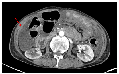 Hình 2: Dày lan tỏa phúc mạc, ngấm thuốc mạnh sau tiêm (mũi tên đỏ).