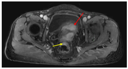 Hình 5: Vị trí cạnh đáy tử cung hai bên có các đám ngấm thuốc mạnh, lớn nhất kích thước 18x19mm, ranh giới không rõ với lớp cơ ngoài tử cung và các quai ruột lân cận (mũi tên đỏ). Trực tràng xẹp, hạn chế đánh giá,sơ bộ thấy dày nhẹ thành trước trực tràng cao, dày nhất 7mm, trên đoạn dài 50mm, tăng ngấm thuốc nhẹ sau tiêm, không thấy mất cấu trúc lớp, không thấy thâm nhiễm ngoài thành (mũi tên vàng).
