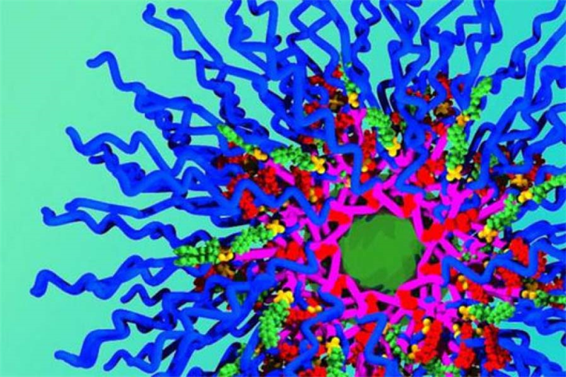 Mô hình hạt nano mang 3 loại phân tử thuốc chống ung thư: doxorubicin màu đỏ, camptothexin màu xanh lục nhỏ và cisplatin lõi màu xanh lục lớn.