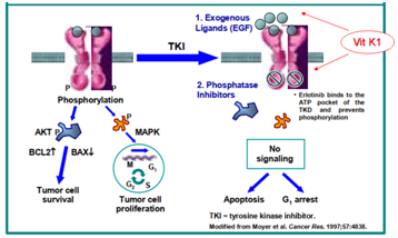 Kích hoạt lại EGFR Tyrosine Kinase là một mục tiêu để ngăn ngừa độc tính cho da. Các nghiên cứu cho thấy Vitamin K1 có khả năng ức chế enzyme phosphatase, từ đó kích hoạt lại quá trình phosphoryl hóa EGFR, dẫn đến tái kích hoạt EGFR và ngăn chặn tác dụng ức chế thuận nghịch của các TKI. Việc sử dụng Vitamin K1 dạng kem bôi tại chỗ trên da giúp điều trị và phòng ngừa độc tính thứ phát của da gây ra bởi các TKI, mà hoàn toàn không ảnh hưởng đến quá trình điều trị bên trong nội bào. Chính vì thế mà kem bôi Vitamin K1 có tác dụng đặc trị giúp xử lý tác dụng phụ nổi mẩn tại chỗ trên da.