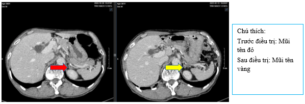 Hình 9: So sánh phim chụp CT bụng trước điều trị nốt tuyến thượng thận ~11mm (mũi tên đỏ) đã giảm nhẹ kích thước sau điều trị còn ~9mm (mũi tên vàng)