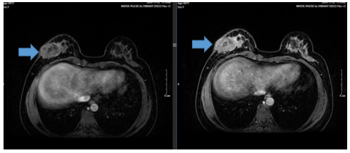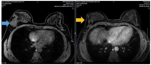 Hình 4: Vú phải vị trí 1/2 dưới , có khối ~50x34mm (Trước điều trị mũi tên xanh). Sau điều trị giảm còn ~ 24x17 mm (Sau điều trị mũi tên vàng)- CT bụng, MRI sọ não: Chưa phát hiện bất thường