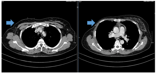 Hình 5: Hình ảnh CT ngực 13 chu kì điều trị phác đồ TCHP- HP u vú phải đã cắt ( mũi tên xanh) không phát hiện hạch, khối bất thường trên CT ngực