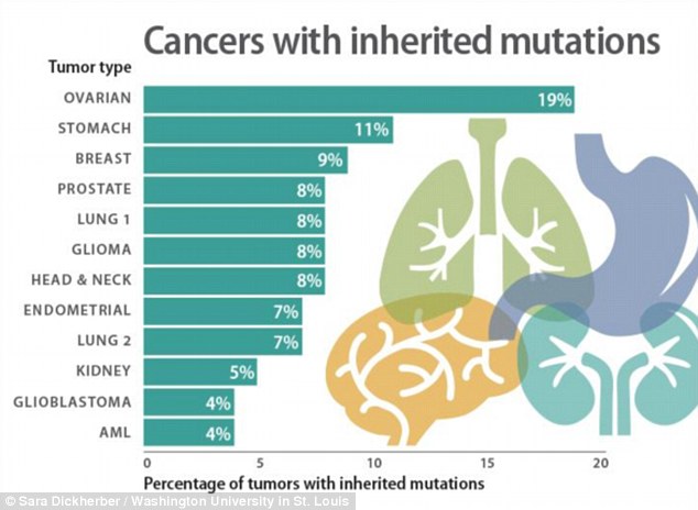 Hơn thế nữa, các nhà khoa học tại Đại học Washington đã phát hiện ra khoảng 12 loại bệnh ung thư sẽ phát sinh do đột biến di truyền, bao gồm: ung thư buồng trứng, dạ dày, vú, tuyến tiền liệt, 2 loại ung thư phổi, thần kinh đệm, đầu và cổ, nội mạc tử cung, thận, u nguyên bào xốp, bạch cầu tủy cấp tính.