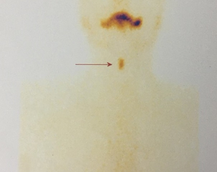 Hình ảnh tăng hoạt độ phóng xạ tại vị trí giường tuyến giáp.