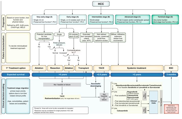 Hình 1: Phân loại giai đoạn và chiến lược điều trị BCLC cập nhật năm 2022 [6].