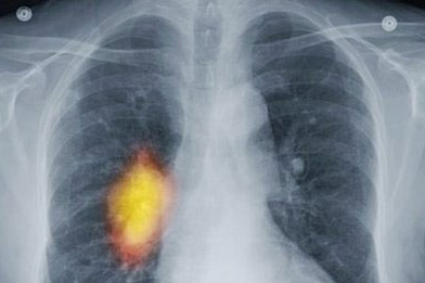 Ảnh chụp X-quang phổi của một người bị ung thư, khối u ung thư có màu vàng