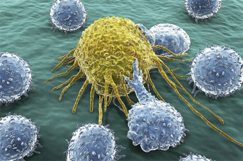 Một tế bào ung thư (màu vàng, ở giữa) bị các tế bào miễn dịch xung quanh tấn công.