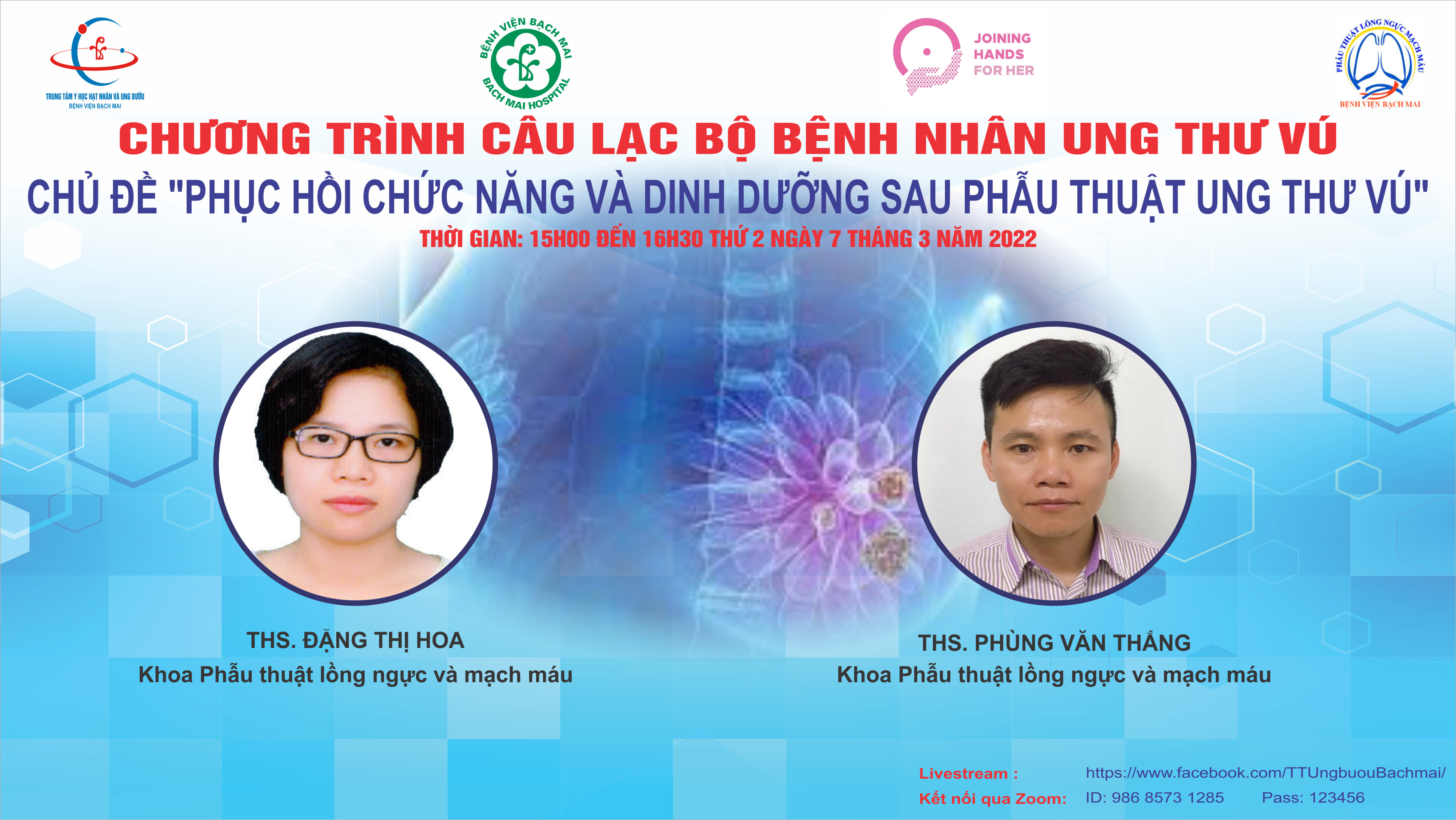 Sinh hoạt câu lạc bộ bệnh nhân ung thư vú trực tuyến Ngày đăng: 04/03/2022 Lượt xem 2711 Bệnh viện Bạch Mai tổ chức câu lạc bộ bệnh nhân ung thư vú trực tuyến Chủ đề: “Phục hồi chức năng và Dinh dưỡng sau phẫu thuật Ung thư vú”Thời gian: 15h-16h30 chiều ngày thứ hai, 7/3/2022 Hình thức: trực tuyến qua Zoom: https://zoom.us/j/98685731285?pwd=Ty9MNnE1WmxZWFFhbmRHSmM5TnlQZz09 ID cuộc họp: 986 8573 1285 Mật mã: 123456 và trên Fanpage Trung tâm Y học hạt nhân và Ung bướu, Bệnh viện Bạch Mai: https://www.facebook.com/TTUngbuouBachmai/Trân trọng kính mời bệnh nhân, người nhà bệnh nhân ung thư vú và những người quan tâm tham dự.