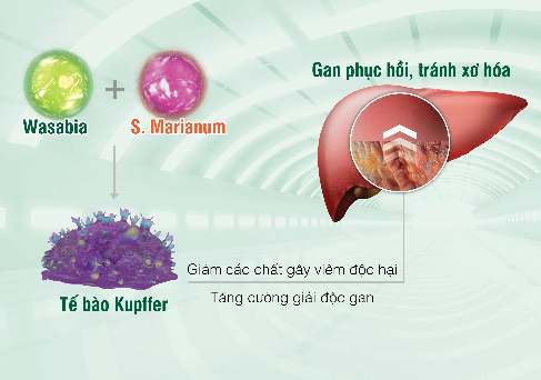 Từ các nghiên cứu chuyên sâu, các nhà khoa học Mỹ đã phát hiện 2 tinh chất là Wasabia và S. Marianum thiên nhiên có tác dụng kiểm soát tế bào Kupffer, giúp hạn chế quá trình sản sinh các chất gây viêm làm hại gan, ngăn ngừa sự tiến triển từ viêm gan, tăng men gan đến xơ gan, ung thư gan và tăng cường sức mạnh giải độc, chống độc cho gan.