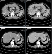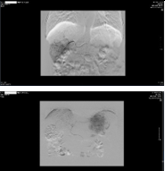 Hình 7. Khối u gan phải và trái giảm kích thước (max 5,0x4,2cm) chỉ còn một phần nhỏ ngấm thuốc – Tái thông nhánh phải tĩnh mạch cửa |