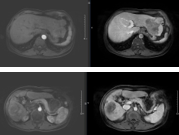 Hình 5. Kết quả chụp MRI gan-mật sau TACE lần 3 một tháng, khối u gan hai bên vẫn tăng sinh mạch nhiều, có nốt mới cạnh khối cũ, huyết khối nhánh phải tĩnh mạch cửa |