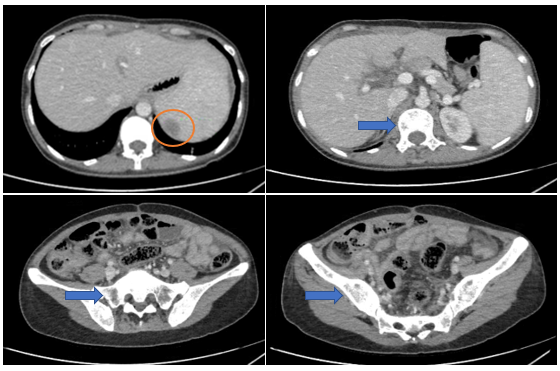 Hình 6. Hình ảnh nốt ngấm thuốc kém ở lách (vòng tròn màu cam). Các ổ khuyết xương lan tỏa nhiều vị trí (mũi tên màu xanh) trên phim chụp cắt lớp vi tính.