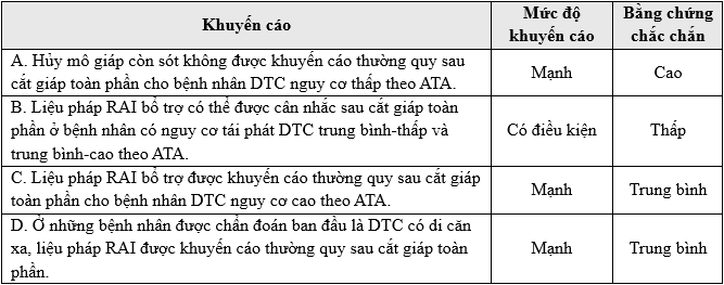 Bảng 7. Tóm tắt các khuyến cáo về sử dụng RAI ban đầu sau cắt tuyến giáp.