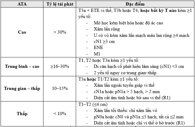 Trong hướng dẫn ATA 2015 gợi ý rằng việc sử dụng I-131 có hiệu quả cao trên những nhóm bệnh nhân có: giải phẫu bệnh ung thư tuyến giáp bất lợi, hạch di căn rộng,nồng độ Tg sau mổ cao, lớn tuổi. Trong hướng dẫn ATA 2025 cho thấy rằng không phải tất cả tiêu chí trong ATA nguy cơ trung bình đều dự báo cùng một nguy cơ tái phát, vì vậy chia thành 2 mức nguy cơ nhỏ hơn: (1) Nguy cơ trung bình – thấp,(2) Nguy cơ trung bình – cao.