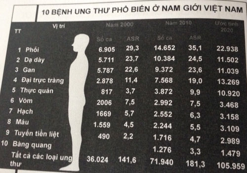Phổi, dạ dày, gan, đại trực tràng là những loại ung thư nam giới Việt Nam hay mắc.