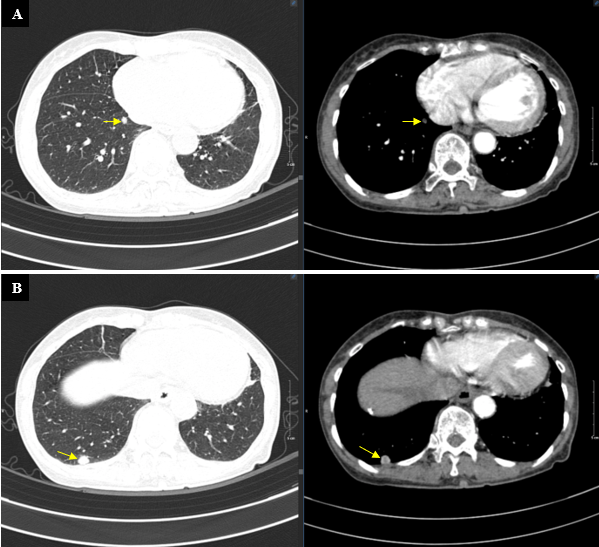 - Chụp CT lồng ngực: Nhu mô phổi hai bên rải rác vài nốt đặc, nốt lớn thuỳ trên phổi trái, kích thước 10x11mm - Theo dõi thứ phát.