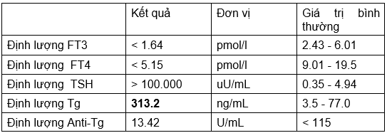 Bệnh sử: Bệnh nhân đã được chẩn đoán ung thư tuyến giáp thể nhú và đã được phẫu thuật cắt toàn bộ tuyến giáp, nạo vét hạch cổ năm 2004 tại bệnh viện K. Từ năm 2004 đến năm 2011, bệnh nhân đã điều trị I-131 4 lần với tổng liều 430 mCi (30 mCi, 100 mCi, 150 mCi, 150 mCi), lần cuối năm 2011. Sau đó duy trì hormon thay thế Levothyrox và tái khám định kỳ. Đợt này bệnh nhân tái khám đã chụp CT ngực phát hiện nhu mô thuỳ trên phổi trái có rải rác vài nốt đặc, nốt lớn nhất kích thước 10x11mm nên vào Trung tâm Y học hạt nhân và Ung bướu – Bệnh viện Bạch Mai để đánh giá và điều trị tiếp.