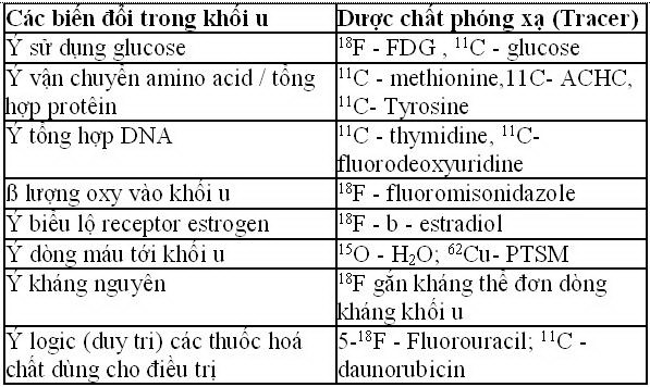 - Các khối u thường có hiện tượng phân huỷ glucose kị khí và ưa khí hơn so với các tổ chức bình thường, do đó các khối u có nhu cầu sử dụng glucose cao hơn tổ chức bình thường. Nếu gắn glucose với 18F (18F -FDG) hoặc 11C (11C-Glucose) thì các dược chất phóng xạ này sẽ tập trung tại các khối u ác tính nhiều hơn tổ chức lành.