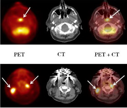 4. Ghi hình khối u bằng máy PET (Ghi hình khối u theo nguyên tắc chuyển hoá) và PET/CT- Ứng dụng đặc biệt quan trọng của PET là phát hiện khối u ung thư cũng như theo dõi sự tái phát ung thư, đánh giá kết quả của các phương pháp điều trị. Nếu như CT, MRT cung cấp hình ảnh giải phẫu rõ nét thì PET vừa cho chúng ta hình ảnh giải phẫu vừa cho hình ảnh chức năng chuyển hoá của khối u. Do vậy, nhìn chung ghi hình khối u bằng PET có độ nhạy và độ đặc hiệu cao hơn nhiều so với các phơng pháp chẩn đoán hình ảnh khác, đặc biệt là khả năng phát hiện các khối u ở giai đoạn rất sớm khi mà các phơng pháp chẩn đoán khác chưa phát hiện thấy.