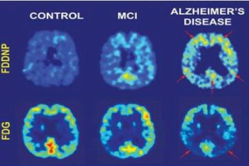 Trong thần kinh học và tâm thần học, PET (khi sử dụng FDG: 18F-deoxyglucose) được ứng dụng để chẩn đoán và đánh giá bệnh động kinh, chứng mất trí nhớ (Bệnh Alzheimer)... Trước đây phương pháp chẩn đoán chứng mất trí nhớ đòi hỏi phải có nhiều cách đánh giá, tốn kém và kéo dài nhiều năm. PET giúp chẩn đoán phân biệt sớm cho bệnh Alzheimer và các chứng mất trí khác.