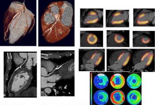 Bệnh nhân bị nhồi máu cơ tim trước vách và được đặt stent cấp cứu ở nhánh chéo đầu tiên ở động mạch xuống trước trái. Chụp mạch cho thấy dòng chảy phía sau stent bình thường. FDG PET cho thấy không có dấu hiệu cơ tim còn sống ở vách tim ngoại vi do nhồi máu cơ tim cũ. Phân tích độ dày và chuyển động của vách tim trên cửa sổ CT cho thấy vách cơ tim mỏng và giảm vận động của vách trước