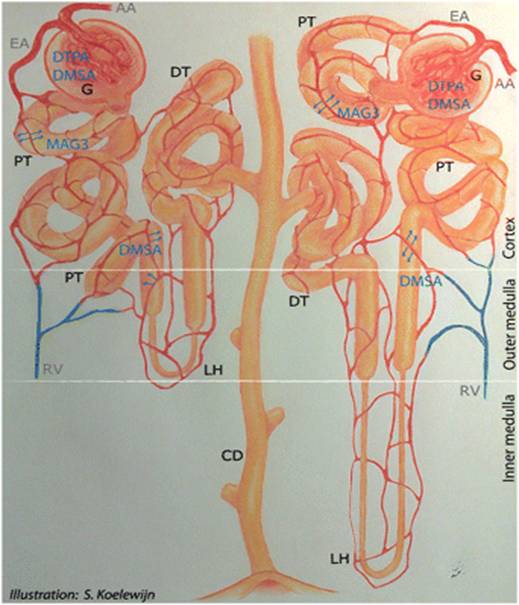 Hình 1. Sơ đồ thận (nephron) và các dược chất phóng xạ thường được sử dụng để nghiên cứu chức năng thận và hình thái thận : Máu đi vào các đơn vị chức năng thận qua động mạch thận(AA). Mạng vi mạch cầu thận lọc nước và các phân tử có ích (G) và chuyển xuống các ống lượn gần(PT). Nước được bài tiết vào nước tiểu đầu tiên qua quai (LH). Các ống lượn xa (DT) thu thập lại góp vào(CD) và dẫn xuống bàng quang.Trong ống lượn đầu tiên của PT,các receptors của megalin/cubilin làm nhiệm vụ tái hấp thu các phân tử có ích. Đồng thời bài tiết từ máu động mạch các chất cơ thể không dùng vào PT theo nước tiểu, đó chính là nơi thanh lọc 99mTc-MAG3. còn 111In-DTPA chỉ được lọc qua cầu thận và trực tiếp vào nước tiểu .99mTc-DMSA một phần bị lọc ở cầu thận , một phần tái hấp thu ở PT. 99mTc-DMSA cũng bị bài tiết ra qua mạch quanh vùng thận, đầu tiên vaò phần thẳng của PT tiếp theo vào phần tủy của thận.RV là tĩnh mạch thận. (nguồn ảnh: http://jnm.snmjournals.org/misc/terms.shtml)